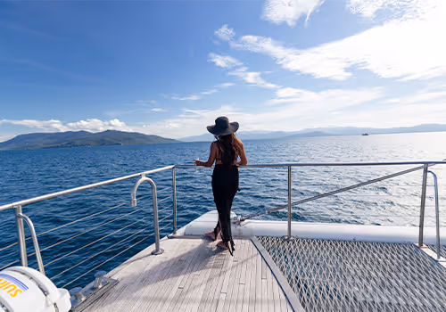 Step aboard and enjoy all the comforts of cruising in style: an air-conditioned cabin with seating and tables, a buffet servery and licensed bar. Outside, choose from undercover seating or relax on the foredeck beneath the sails, and enjoy the tropical breeze and panoramic ocean views. On the homeward journey, it’s the perfect place to enjoy a complimentary glass of sparkling wine.